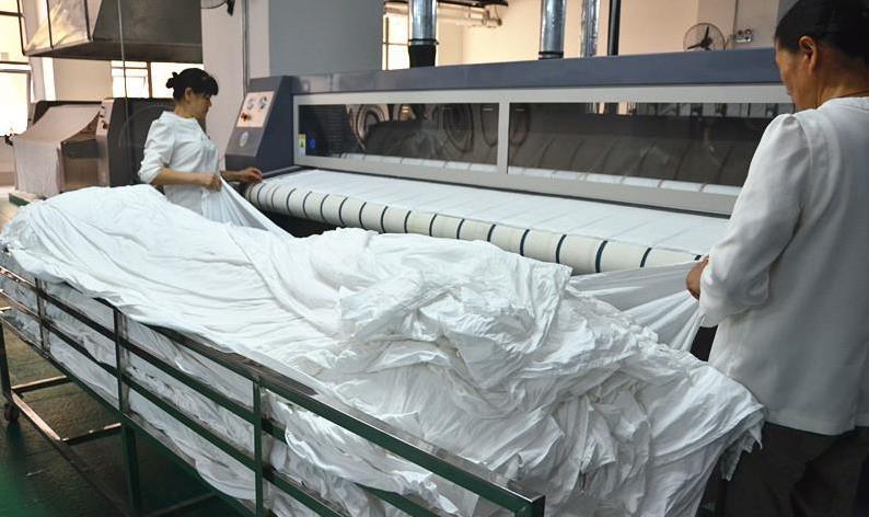 工作人員將洗凈的床單擺放整齊過機,統(tǒng)一通過機器烘熨。